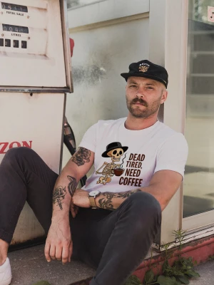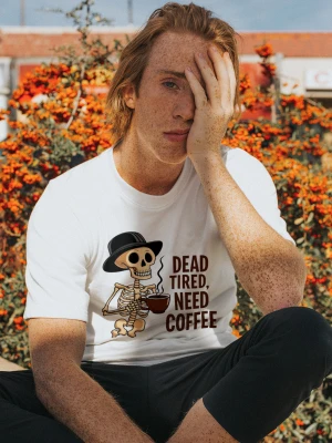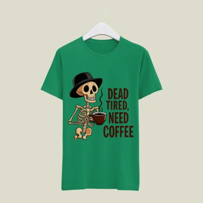 The “Dead Tired, Need Coffee” concept blends the exhaustion of modern life with a fun skeleton twist — representing every coffee lover who can’t start their day without their favorite brew. It’s witty, spooky, and totally relatable — making it perfect not only for Halloween but for everyday wear, coffee shops, or lifestyle brands targeting caffeine fans.